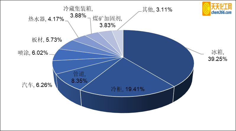 According to Tiantian Chemical Internet research, 2020China’s polyurethane rigid foam production is206.110,000 tons, distributed in refrigerators, freezers, pipelines, automobiles , spraying, plates, water heaters, refrigerated containers, coal mine reinforcement and other industries. Among them, rigid polyurethane foam accounts for the largest proportion in the refrigerator industry, accounting for 39.25% of the total output of rigid polyurethane foam; followed by the refrigerator industry, accounting for 19.41%. As the refrigerator freezer industry maintains rapid growth in the future, the refrigerator freezer industry will still be the main growth point of polyurethane rigid foam.