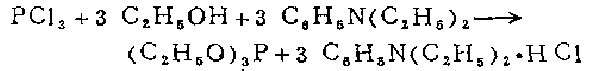 2. Equipped with a closed stirrer and a high-efficiency reflux condenser In a 3-liter three-necked flask with a 500-ml dropping funnel, put 447 grams (477 ml, 3 mol) of absolute ethanol and 1 liter of dry petroleum ether (boiling point 40-60°C) into a 3-liter three-neck flask. ) freshly steamed diethylaniline solution. Put 400 ml of dry petroleum ether and 137.5 g (87.5 ml, 1 mol) of freshly distilled phosphorus trichloride solution into the dropping funnel. The flask was cooled in a cold water bath. Under vigorous stirring, add phosphorus trichloride solution dropwise, and the mixture can be gently refluxed at the dropping speed. It takes about 30 minutes to finish dripping. After the addition is complete, continue heating and stirring to allow gentle reflux for 1 hour. Cool the suspension containing a large amount of diethylaniline hydrochloride precipitate, use a glass core funnel to suction and filter the dry amine salt filter cake on the water pump, and wash with 5 parts of 100 ml dry petroleum ether (boiling point 40-60°C). Combine the filtrate and washing liquid, and use a 75 cm long pine needle-shaped fractionating column on a water bath for distillation and concentration. The residue was transferred to a pear-shaped flask and distilled under reduced pressure with a water pump using a 75 cm long pine needle-shaped fractionating column. After steaming out a small amount of the front fraction, collect the product at 57-58℃/16mm (51-52℃/13mm, 43-44℃/10mm). The yield of the colorless product is 138g (83%)