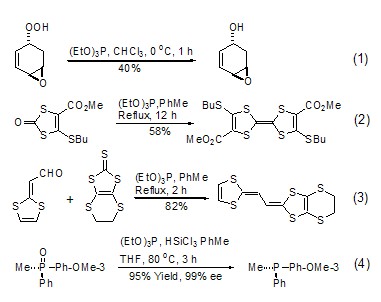 Triethyl phosphite is used as a reducing agent. During the reaction, the phosphorus atom itself is oxidized from +3 valence to +5 valence, and it also has the function of taking away oxygen atoms or sulfur atoms from another reactant. , generating the corresponding triethyl phosphate. For example: triethyl phosphite can reduce peroxy compounds to alcohols, and can selectively reduce one of them in the presence of two peroxy groups under controlled conditions (formula 1)[1]. 1,3-Dimercaptoketone can undergo coupling reaction in the presence of triethyl phosphite (Formula 2)[2]. Refluxing triethyl phosphite with aldehyde and 1,3-dimercaptothione can give the corresponding olefin (formula 3)[3]. According to literature reports, triethyl phosphite can also undergo oxygen exchange reactions with other phosphates (Formula 4)[4].