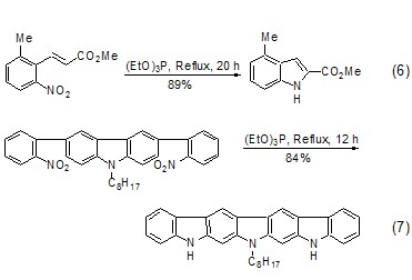 Triethyl phosphite-led Another well-known reaction is the Cadogan reaction [7], which is an important method for the synthesis of polycyclic nitrogen-containing heterocyclic compounds. When the aryl nitro functional group is heated with triethyl phosphite, the nitro group can be reduced to nitrene. Nibenine then attacks other olefinic bonds or aromatic rings in the molecule to generate polycyclic nitrogen-containing heterocyclic compounds. In the Cadogan reaction, triethyl phosphite generally serves as both reactant and solvent. For example: o-vinyl-substituted nitrobenzene and triethyl phosphite are co-thermally generated to form indole derivatives (Formula 6)[8,9]. The co-heating of o-aryl-substituted nitrobenzene and triethyl phosphite produces carboline derivatives (Formula 7)[10,11].