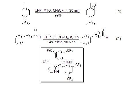UHP has the properties of hydrogen peroxide and is often used in the epoxidation reaction of double bonds, and has a high degree of regio- and stereoselectivity as well as a high conversion rate. UHP combined with acid anhydrides (such as acetic anhydride, maleic anhydride) can generate organic peroxyacids in situ. This method can replace the use of high concentrations of organic peroxyacids. For the epoxidation reaction of α,β-unsaturated ketone and benzoquinone, the catalysis of a base is generally required, such as K2CO3[3]. The combination of UHP and methylrhenium trioxide (MTO) enables the epoxidation reaction of olefins with excellent regio- and stereoselectivity (Formula 1)[4]. For the asymmetric oxidation of α,β-unsaturated aldehydes, UHP shows better stereoselectivity and conversion rate than other oxidants (Formula 2)[ 5].