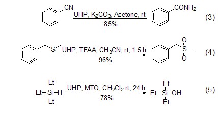 Since the oxidation properties of UHP can be easily controlled, it can be used to convert a variety of functional groups, such as converting cyano groups into amides, oximes into nitro groups, aldehydes into acids, etc. (Formula 3, Formula 4)[6]. Another important use of UHP is the oxidation reaction of heteroatoms such as N, S, P, I[2,6] and Si (Formula 5)[7] . In most cases its selectivity is better than hydrogen peroxide aqueous solution.