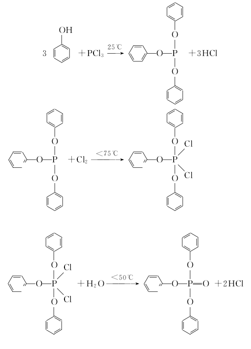 Methods include: (1) Phosphorus oxychloride direct method (hot method) and phosphorus trichloride indirect method (cold method). (1) Thermal method Dissolve phenol in pyridine and anhydrous benzene solvent, slowly add phosphorus oxychloride at a temperature not exceeding 10°C, and then react at reflux humidity for 3-4 hours. After cooling to room temperature, the reactant is Wash with water to recover pyridine, use it to dry sodium sulfate for dehydration, filter to remove sodium sulfate, and distill under normal pressure to recover benzene; distill under reduced pressure to collect the 243-245°C/1.47KPa fraction, and obtain the finished product after cooling, crystallization, and crushing.