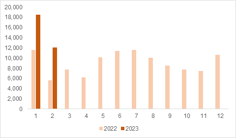 Figure 1 Unlisted diols (including BDO) in China from 2022 to 2023 ) Monthly export statistics (unit: tons)