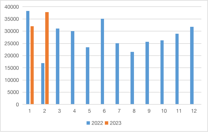 Export toluene diisocyanate (TDI) in February 2023 37,829 tons, the export value is 89.8413 million US dollars, and the average price is 2,375 US dollars / ton. The export volume increased by 18.14% compared with the previous month and increased by 123.05% compared with the same period last year.