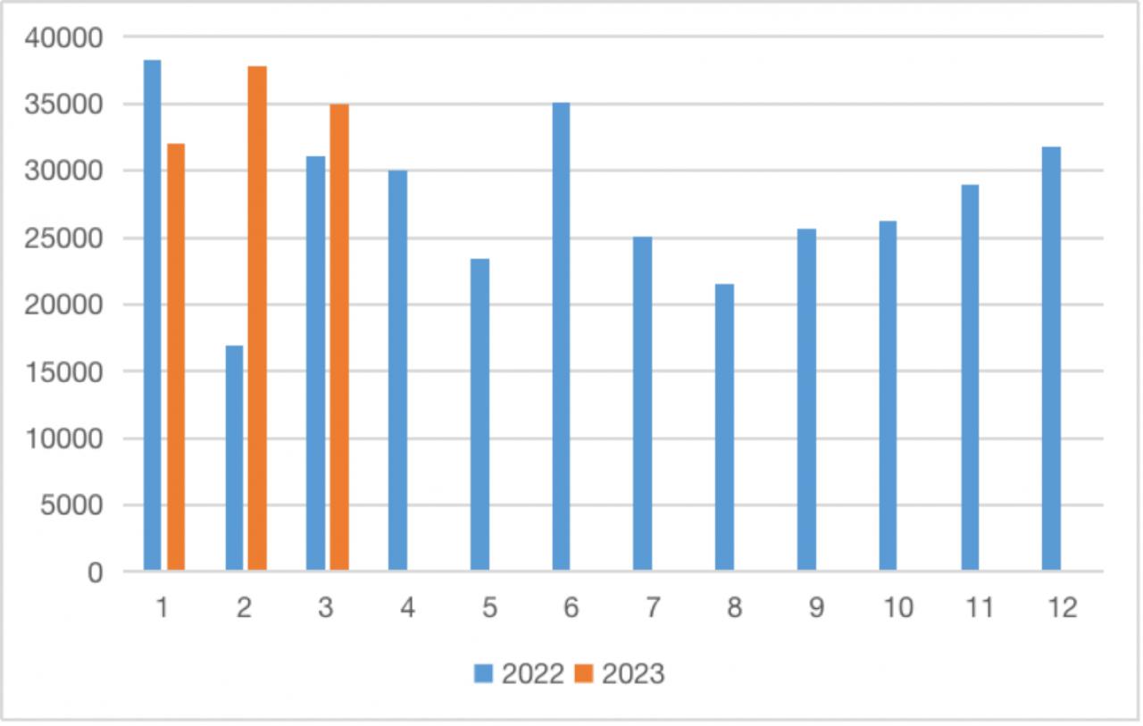 Figure1 2022-2023 year1-12Month ChinaTDIExport statistics (unit: tons)