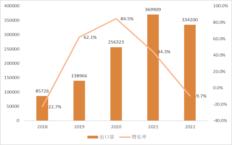 Figure2:2018-2022ChinaTDIExport volume and year-on-year growth rate (tons, %)